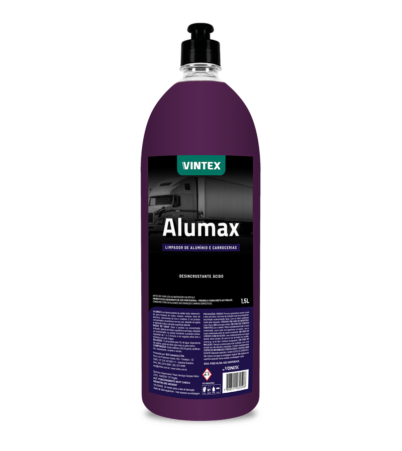 Alumax é um desincrustante de caráter ácido, desenvolvido para limpeza de rodas, chassis, motores, baús de alumínio, carrocerias de inox e madeira. É um produto concentrado e econômico em seu uso, atuando na sujeira e retirando toda a camada superficial aderida.