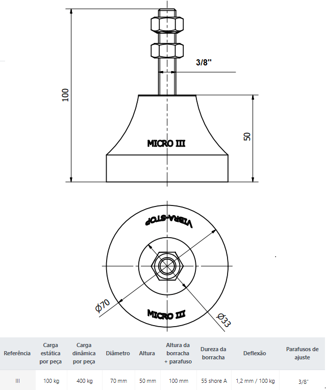 Amortecedor vibra-stop micro-iii rosca 3/8 - capacidade 350 kg