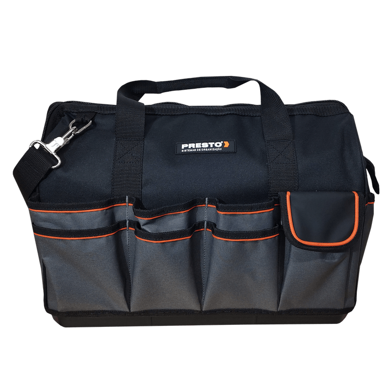 Facilidade para levar suas ferramentas para onde precisar! A bolsa para ferramentas da Presto foi projetada para proporcionar praticidade e segurança no armazenamento e transporte de ferramentas e acessórios em geral. Produzida em poliéster 600D, muito fácil de limpar. Contém bolsos laterais para maior armazenamento. Fundo em plástico reforçado para máxima durabilidade, melhor suporte e maior facilidade de movimentação. Possui 22 bolsos.