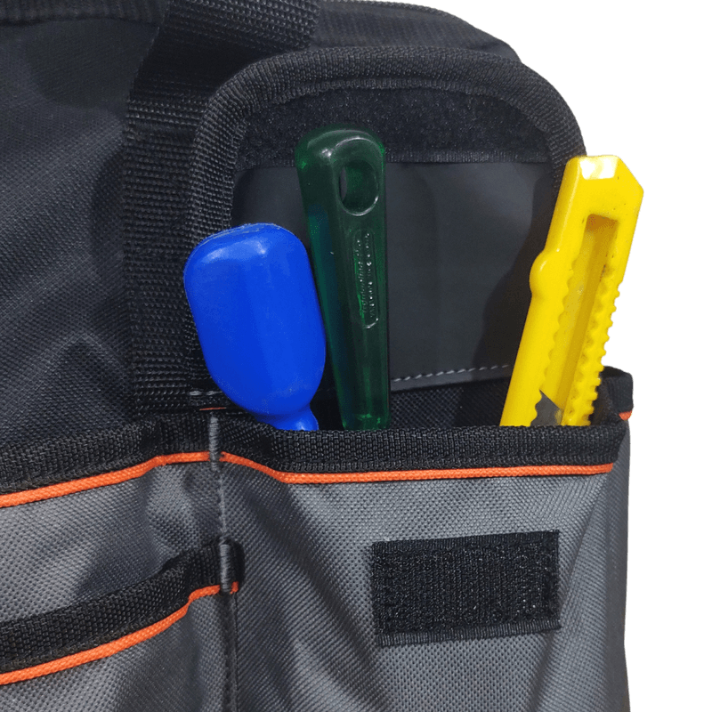 Com um total de 22 bolsos, sendo 12 externos e 10 internos, esta bolsa oferece amplo espaço para armazenar uma variedade de ferramentas e acessórios. A disposição dos 12 bolsos externos é estratégica: são 4 bolsos laterais, 1 bolso traseiro em rede e 7 bolsos frontais. Além disso, um dos bolsos frontais possui fechamento em velcro para garantir a segurança dos itens armazenados. Já os 10 bolsos internos fornecem espaço adicional para organizar ferramentas de diferentes tamanhos e formas, mantendo tudo acessível e fácil de encontrar.