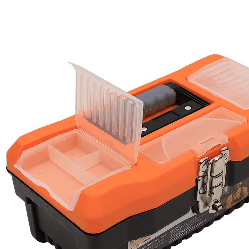 Uma das principais características desta caixa é a tampa, que possui dois compartimentos removíveis e um fixo. Esses compartimentos organizam perfeitamente pequenos itens, como parafusos, pregos, brocas e outras peças pequenas que frequentemente se perdem ou se misturam quando armazenados em um único espaço. A flexibilidade proporcionada pelos compartimentos removíveis permite que você personalize o armazenamento conforme suas necessidades específicas. Além disso, garante que todas as suas ferramentas e acessórios estejam sempre à mão e facilmente acessíveis.