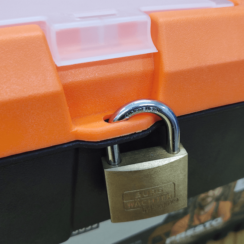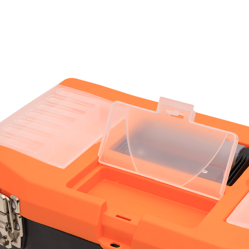 Uma das principais características desta caixa é a tampa, que possui dois compartimentos removíveis e um fixo. Esses compartimentos organizam perfeitamente pequenos itens, como parafusos, pregos, brocas e outras peças pequenas que frequentemente se perdem ou se misturam quando armazenados em um único espaço.