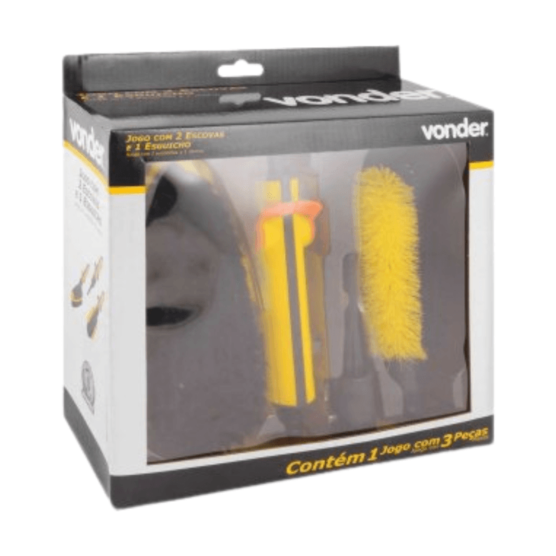Jogo com 2 escovas e 1 esguicho com conector de 1/2” para Mangueira - Vonder Indicado para limpeza em geral. As escovas são ideais para limpeza de automóveis, pneus, rodas, caixa de ar e tapetes, pisos, vidros, fachadas, entre outros, e o esguicho para limpeza de calçadas, veículos e jardinagem. As cerdas podem reter resíduos que riscam a superfície. :: Material: Cerdas em Nylon com cabo plástico :: Dimensões com cabo: escova para furo de roda: 36,5 cm / escova fixa reta: 38 cm / esguicho: 30 cm :: Conectado diretamente na mangueira de jardim. As escovas limpam e enxaguam ao mesmo tempo, sendo práticas e fáceis de usar. Garantia do fabricante de 90 dias contra defeitos de fabricação. Marca: Vonder