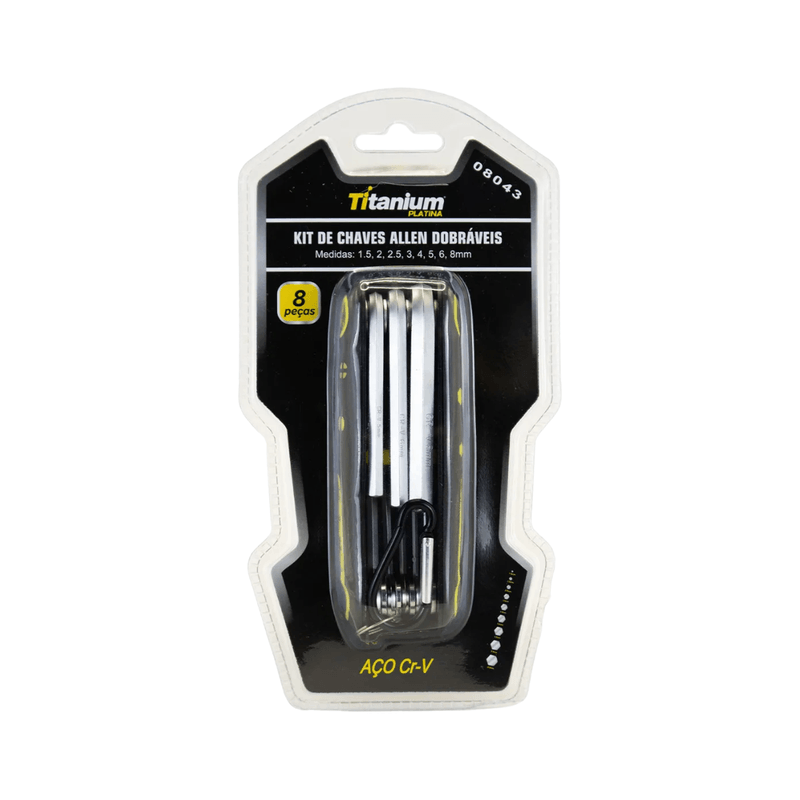 O Jogo de Chaves Allen Dobráveis Titanium é a solução prática e portátil para apertar e soltar parafusos com encaixe sextavado interno. Com estrutura tipo canivete, é ideal para quem busca organização e facilidade de transporte. Fabricado em aço Cromo Vanadium com acabamento cromado, oferece alta resistência, durabilidade e proteção contra corrosão.