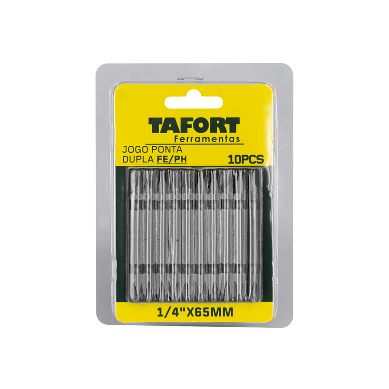 O Jogo de Pontas Duplas Tafort 65mm oferece a melhor relação custo-benefício para profissionais que utilizam parafusadeiras intensamente. Composto por 10 unidades, este kit garante que você tenha sempre à mão a ponteira correta para os parafusos mais comuns do mercado.