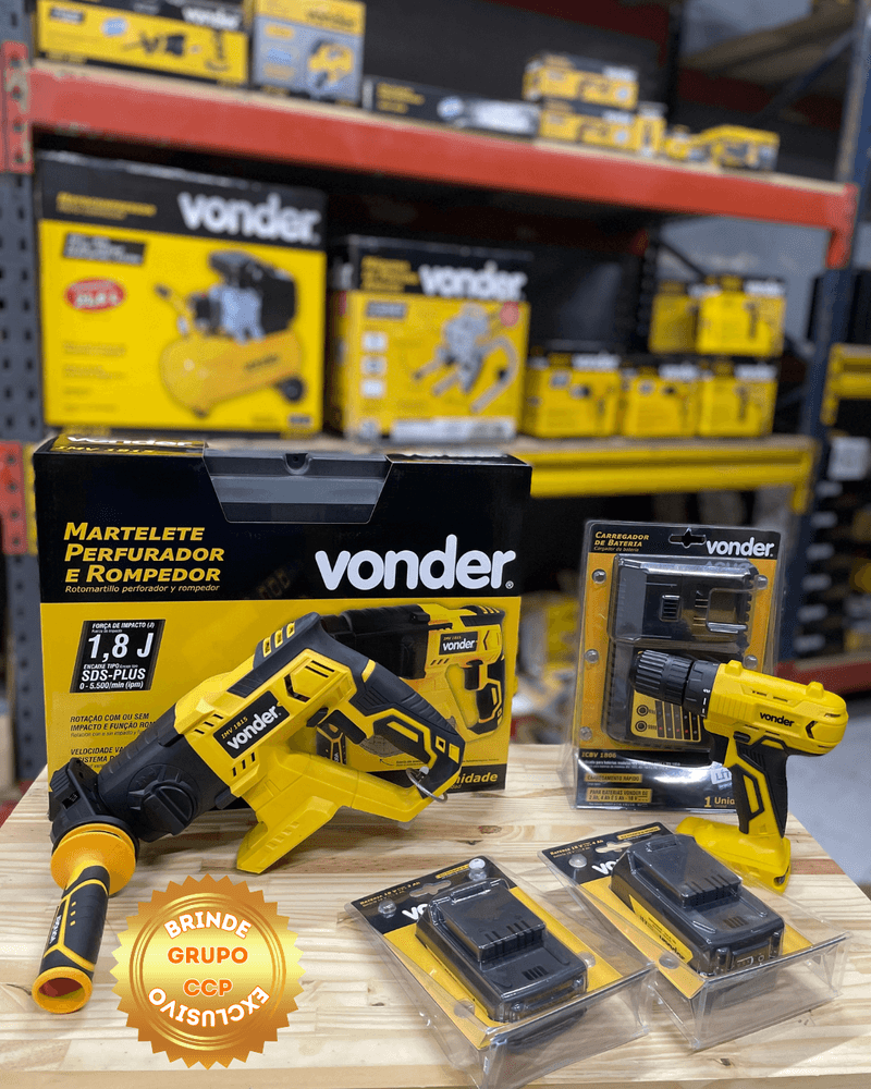 O kit ideal para quem busca potência, autonomia e versatilidade em trabalhos de perfuração, fixação e rompimento. Composto por ferramentas e acessórios da linha intercambiável 18V Vonder, garante praticidade e desempenho profissional.