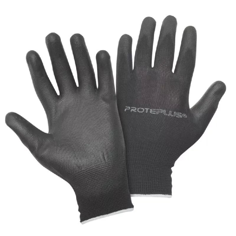 Luva de Segurança tricotada em Poliamida revestida em Poliuretano na face palmar e pontas dos dedos, dorso sem revestimento.