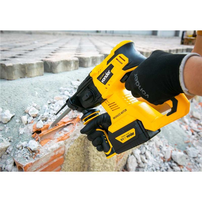 Este equipamento utiliza um modelo de bateria que pode ser intercambiável (não acompanha), ou seja, uma bateria que é compatível com outros modelos de ferramentas a bateria VONDER. Por isso, em sua próxima compra de ferramenta a bateria VONDER, procure um modelo que comece com a referência I, ou que esteja identificado com o selo Bateria Intercambiável VONDER. Desta forma, você garante modelos mais econômicos, sem a necessidade de aquisição de novas baterias e carregadores para uso em seu equipamento. Possui rotação com ou sem impacto e função rompedor, adequando-se a diferentes necessidades de uso.