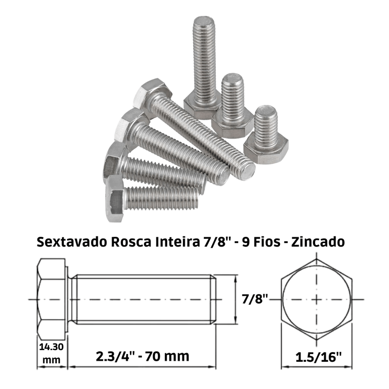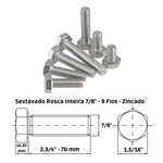 Parafuso sextavado de ferro rosca inteira 7/8-9 x 2-3/4 unc zincado