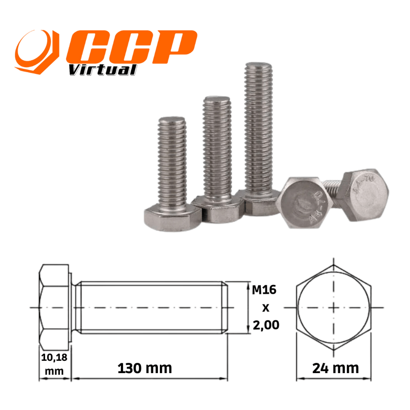 FixaçãoParafusos Sextavado em Inox 304Parafuso sextavado rosca inteira inox 304 - m16-2,00 x 130