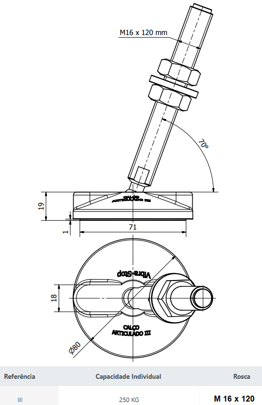 Pé Nivelador Articulado / -M16X120 Poliamida Reforçada com Fibra de Vidro / Rosca Aço Zincado Rosca: M 16 X 2.0 / Compr. da Rosca: 120 mm Diâm. da Base: 80 mm Comprimento Total: 140 mm Capacidade da Carga: 100 kg Garantia - 90 dias ( Defeito de Fabricação ) Marca - Vibra Stop