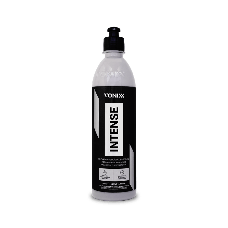Intense é um renovador de plástico com proteção UV, cuja fórmula balanceada promove acabamento natural e toque seco, com durabilidade de 6 meses. O produto deve ser utilizado especificamente na parte interna do automóvel, em superfícies como vinil e plástico em geral.