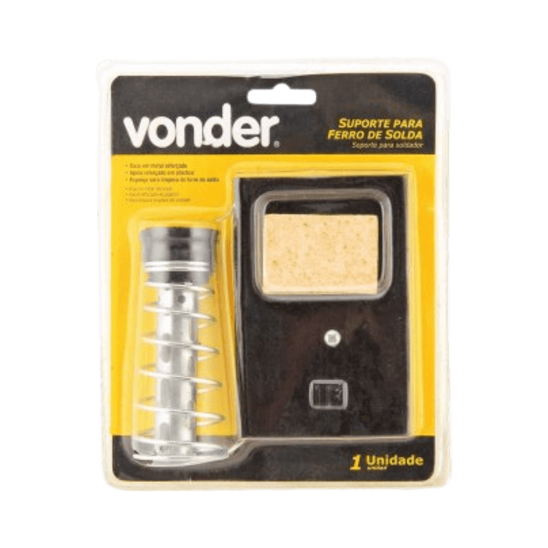 Suporte para Ferro de Solda - Vonder Indicado para apoiar o ferro de solda, durante e depois da solda em geral. Possui esponja para limpeza da ponta do ferro de solda. :: Material do suporte para ferro solda: Aço carbono :: Conteúdo da Embalagem: 1 Suporte. Garantia do fabricante de 90 dias contra defeitos de fabricação. Marca: Vonder